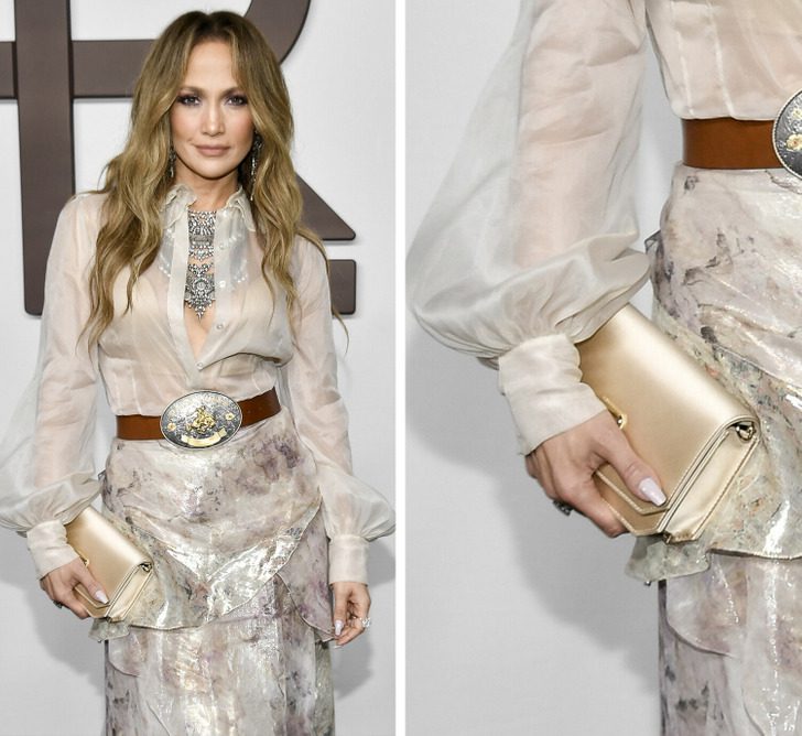 Прикраси — одна з візитівок Дженніфер. Вона ніколи не нехтує деталями, які завершують образ: від культових сережок-кілець до багатошарових намист та ефектних капелюхів у ковбойському стилі. Її вміння доповнювати вбрання яскравими аксесуарами — ще один доказ бездоганного стилю.